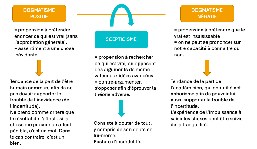 L'attitude sceptique et l'attitude dogmatique peuvent sembler similaires au premier abord. Toutefois, une ligne de démarcation essentielle distingue les deux postures. En effet, pour le sceptique, il est question de remettre en cause la certitude, en validant l'existence d'une vérité. Tandis que le dogmatique, lui, va affirmer une connaissance sans la fonder (dogmatisme positif) ou va prétendre que la vérité est insaisissable, niant de ce fait la possibilité d'une connaissance (dogmatisme négatif).