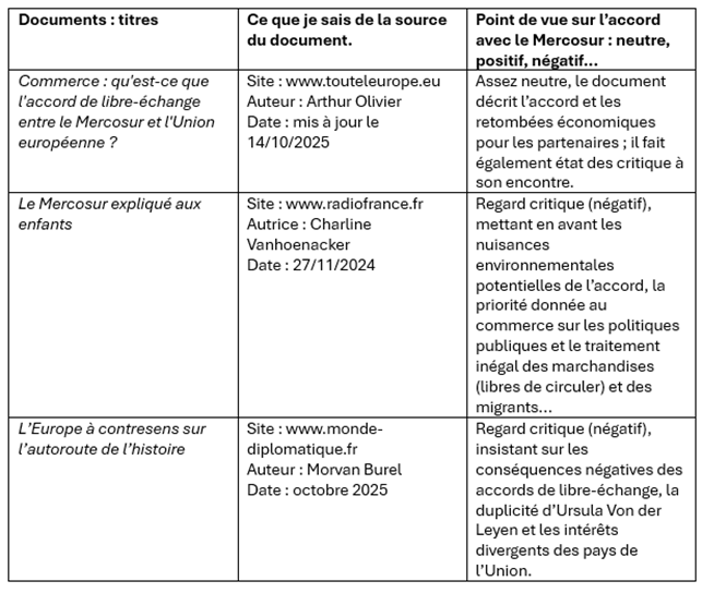 Pour conclure cette étape documentaire, il me semble nécessaire d’insister sur la diversité des regards portés sur l’accord avec le Mercosur, afin de développer chez l'élève, pas à pas, une capacité à relativiser les informations dont il est abreuvé en examinant leur source. On le portera ainsi à aiguiser sa pensée critique, comme y invite le PFTC-S120. On pourra élaborer un tableau de ce type :