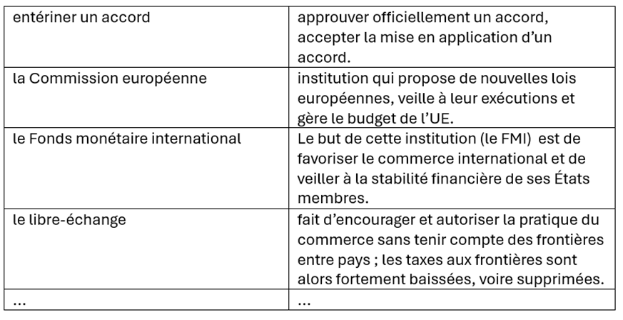 Pour lire de tels extraits, l’élève doit être armé d’un vocabulaire spécifique, lequel constituera, en s’étoffant progressivement, un pan essentiel de sa formation citoyenne. On l’encouragera à rechercher des explications (ou on les lui fournira, en fonction du temps disponible) à des termes clés comme…