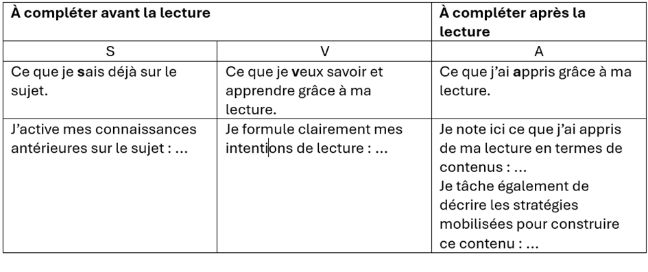 - compléter un tableau SVA pour planifier ma démarche de lecture/écoute ;