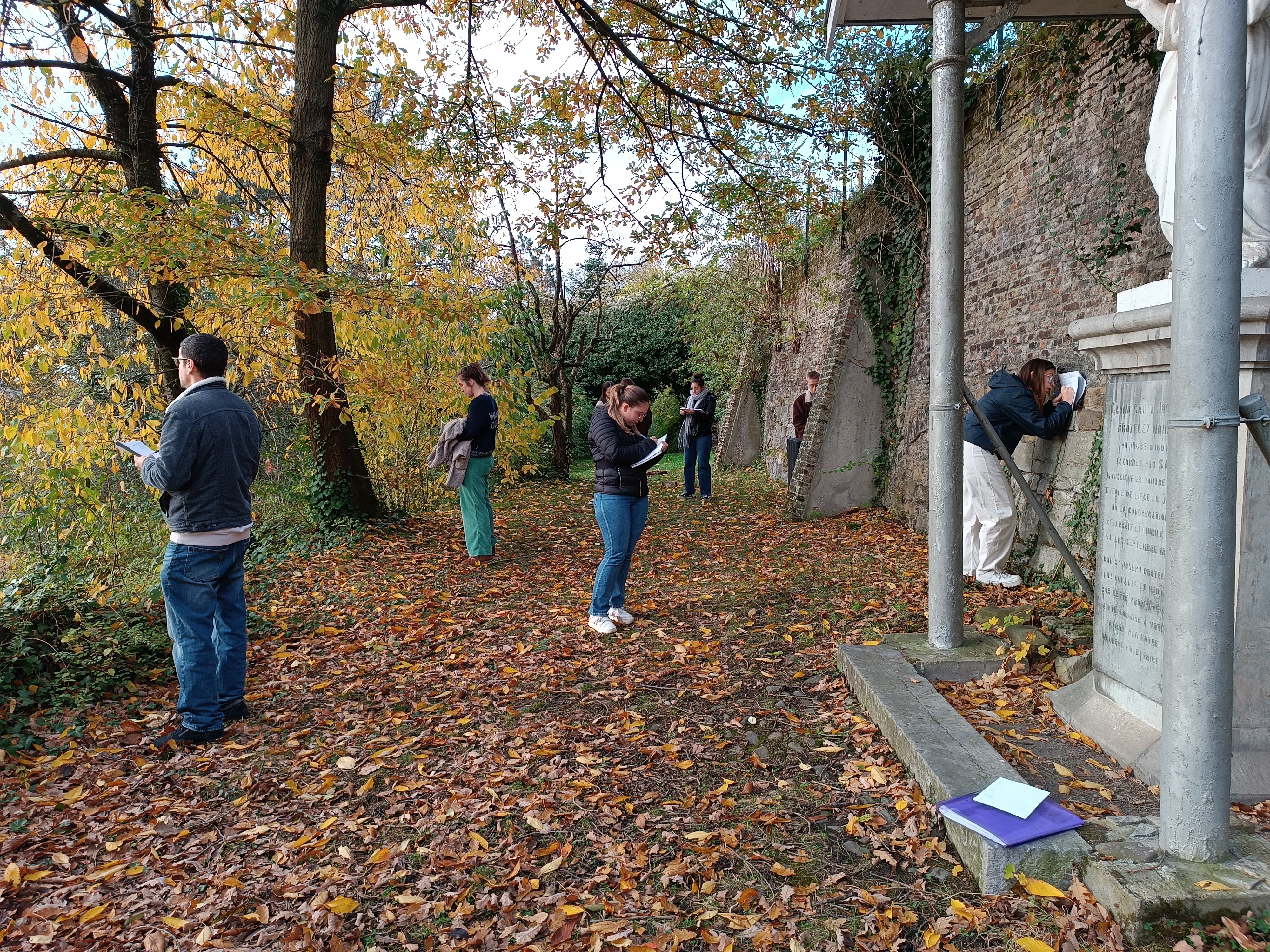 Le groupe s'est rendu dans les jardins de l'ancien couvent des Filles de la Croix de Liège, à deux pas des bâtiments de l'école, où il est possible d'avoir une vue plongeante sur celle-ci et sur la ville. Ils y ont observé le site, l'environnement, ont cherché à percevoir son atmosphère. Pendant l'observation, ils ont pris un maximum de notes dans un tableau divisé en colonnes pour y inscrire ce qui permet de décrire le lieu par l'intermédiaire de la vue, de l'ouïe, de l'odorat et du toucher (les éléments de l'environnement perçus par le corps dans son ensemble). Ils ont aussi imaginé ce qu'un personnage pourrait venir faire dans ce lieu, les pensées qu'il pourrait avoir pendant qu'il s'y trouverait. En fin de promenade, ils ont comparé leurs notes avec celles d'un condisciple pour les compléter, les enrichir mutuellement.