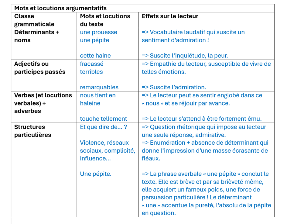 Je propose dès lors, s’il s’agit de didactiser de tels jugements de gout, de partir dans un premier temps de leur force persuasive et d’amener l’élève à identifier dans le texte les éléments qui leur confèrent ce pouvoir de persuasion.